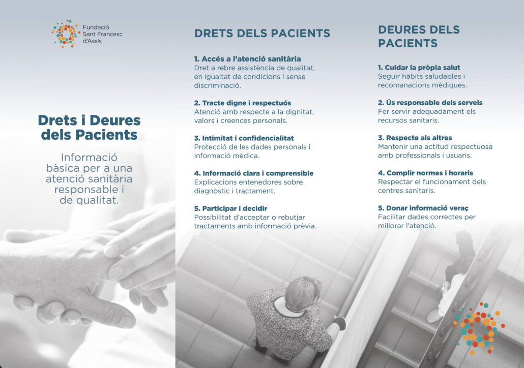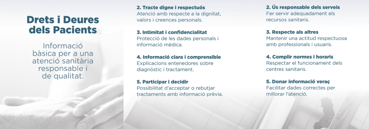 A més, l’atenció ha de fer-se amb respecte a la dignitat, valors i creences personals, protegint les dades personals i la informació mèdica. Aquesta informació ha de ser clara i comprensible, contribuint tot plegat a garantir el dret a participar i decidir sobre la pròpia salut i els tractaments per cuidar-la.